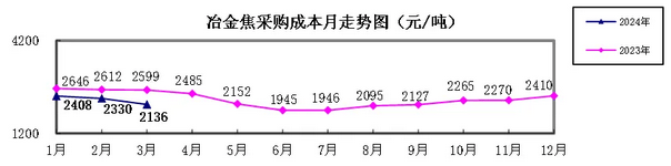 冶金焦3月份加權平均折算成干基的采購成本2136.22元/噸,環比下降194.13元/噸,降幅為8.33%。1-3月累計平均折算成干基的采購成本為2298.25元/噸,同比下降320.86元/噸,降幅為12.25%。
