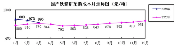 國產鐵精礦(干基)3月份加權平均采購成本為894.53元/噸,環比下降78.12元/噸,降幅為8.03%。1-3月累計平均采購成本為961.24元/噸,同比升高116.27元/噸,升幅為13.76%。