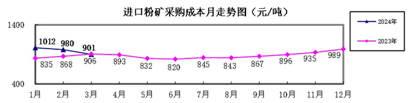 進口粉礦3月份加權平均采購成本900.70元/噸,環比下降79.34元/噸,降幅為8.10%。1-3月累計平均采購成本為961.79元/噸,同比升高91.99元/噸,升幅為10.58%。
