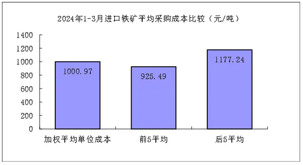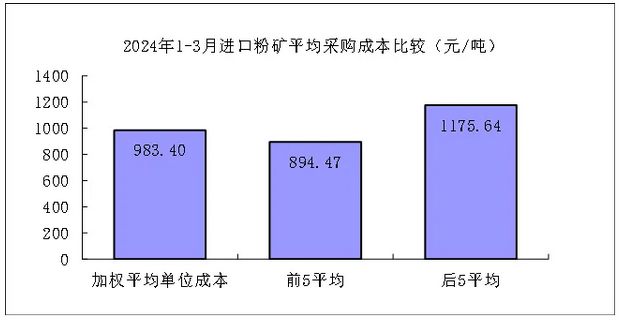 1-3月對標企業進口粉礦折算成62%品位的平均采購成本為983.40元/噸,成本最低的前5家企業的加權平均采購成本為894.47元/噸,比對標企業平均采購成本低88.93元/噸,低于平均采購成本9.04%;而采購成本最高的5家企業加權平均采購成本為1175.64元/噸,比對標企業平均采購成本高192.24元/噸,高于平均采購成本19.55%。