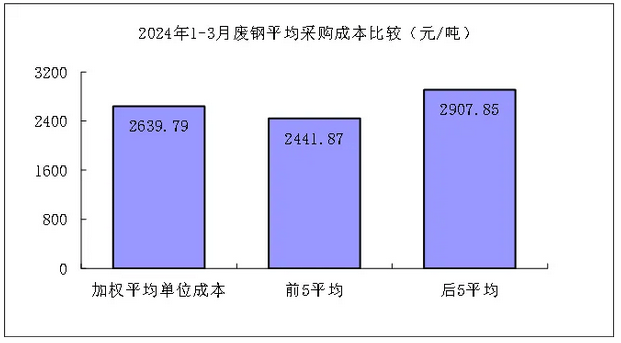 廢鋼3月份加權平均采購成本為2555.67元/噸,環比下降120.47元/噸,降幅為4.50%。1-3月累計平均采購成本為2639.79元/噸,同比下降178.80元/噸,降幅為6.34%。