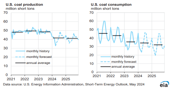 產量方面,《短期能源展望》報告預計,2024年,美國煤炭產量接近5億短噸,高于前一月預期值4.852億短噸,但較2023年的5.816億短噸下降14.1%。2025年,美國煤炭產量預計為4.936億短噸,同比下降1.16%。