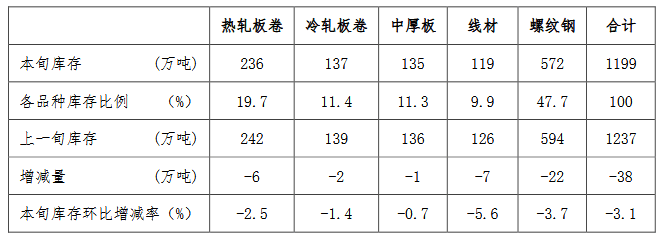 4月下旬,21個城市5大品種鋼材社會庫存1199萬噸,環(huán)比減少38萬噸,下降3.1%,庫存連續(xù)下降,降幅收窄;比3月下旬減少175萬噸,下降12.7%;比年初增加470萬噸,上升64.5%;比上年同期增加48萬噸,上升4.2%。