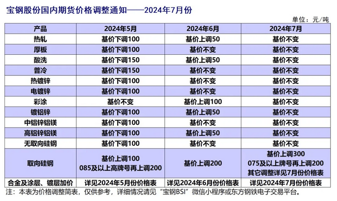 經研究決定,寶鋼股份板材內銷價格2024年7月份在2024年6月份基礎上調整公告如下(以下除特殊注明外,均為不含稅):