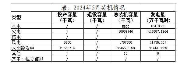 火電方面,5月總裝機容量達到18989746千瓦,發電量達到448887.1264千瓦。