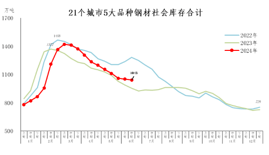 6月中旬,21個城市5大品種鋼材社會庫存1043萬噸,環(huán)比減少10萬噸,下降0.9%,庫存繼續(xù)小幅下降;比年初增加314萬噸,上升43.1%;比上年同期增加87萬噸,上升9.1%。
