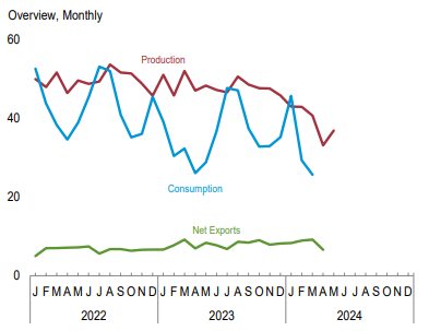 6月25日,美國能源信息署(EIA)發布最新《月度能源回顧》報告顯示,2024年5月份,美國煤炭產量為3679.6萬短噸(3338.08萬噸),較上年同期的4822.3萬短噸下降23.7%,較前一月的3306.7萬短噸增長11.3%。