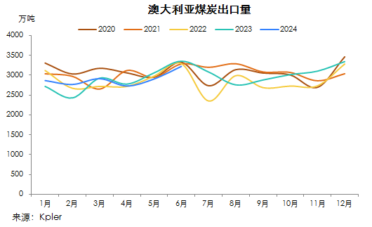 Kpler船舶追蹤數據顯示,2024年6月份,澳大利亞煤炭出口量3221.60萬噸,環比增10.90%,為連續第二個月環比增長,但同比降3.93%。