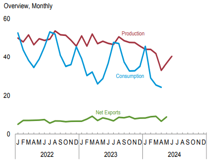 消費方面,報告顯示,2024年4月份,美國煤炭總消費量為2427.1萬短噸,同比下降6.75%,環比下降4.77%。