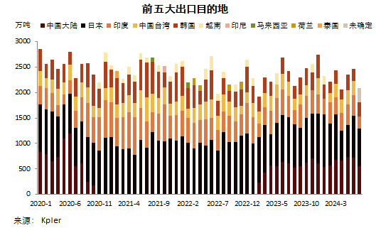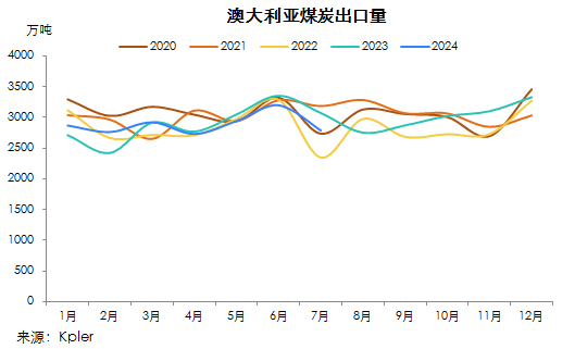 Kpler船舶追蹤數(shù)據(jù)顯示,2024年7月份,澳大利亞煤炭出口量2786.81萬(wàn)噸,環(huán)比降12.82%,在連續(xù)兩個(gè)月增長(zhǎng)后回落,同比降9.26%。