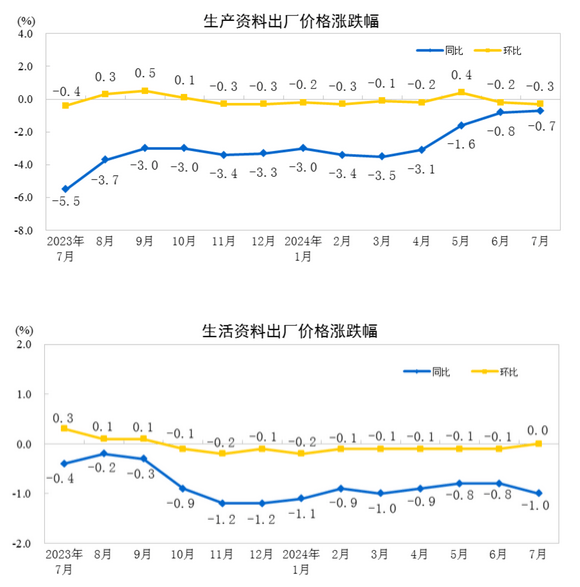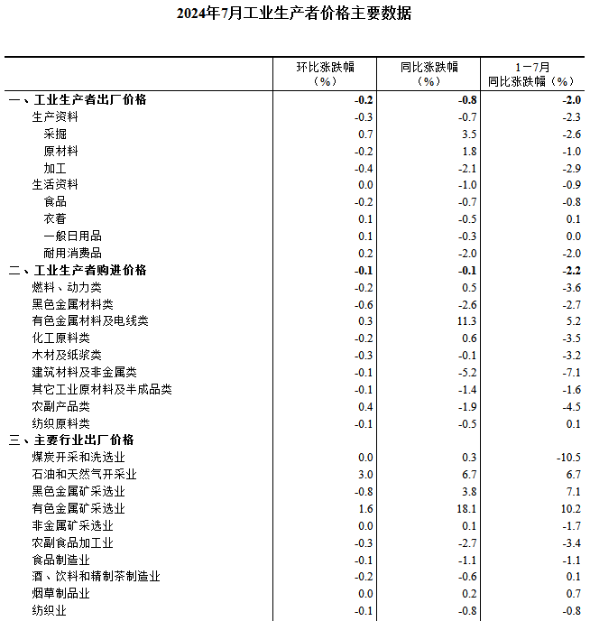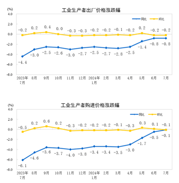 2024年7月份,全國工業生產者出廠價格同比下降0.8%,環比下降0.2%,降幅均與上月相同;工業生產者購進價格同比、環比均下降0.1%。1—7月平均,工業生產者出廠價格比上年同期下降2.0%,工業生產者購進價格下降2.2%。