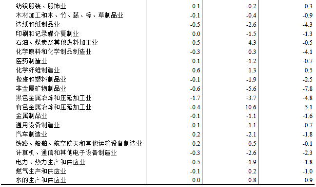工業生產者購進價格中,建筑材料及非金屬類價格下降5.2%,黑色金屬材料類價格下降2.6%,農副產品類價格下降1.9%,紡織原料類價格下降0.5%;有色金屬材料及電線類價格上漲11.3%,化工原料類價格上漲0.6%,燃料動力類價格上漲0.5%。