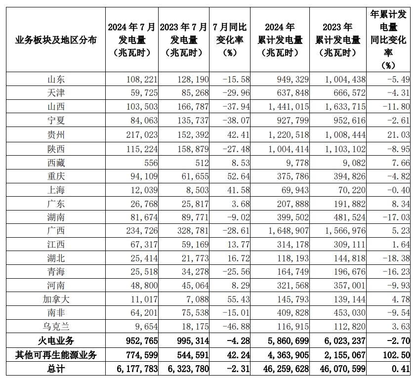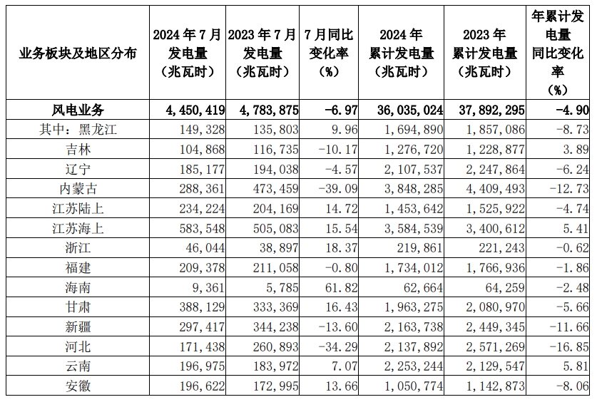 8月8日,龍?jiān)措娏ε?024年7月發(fā)電量數(shù)據(jù)。龍?jiān)措娏Γㄒ韵潞?jiǎn)稱(chēng)“本公司”)2024 年 7 月按合并報(bào)表口徑完成發(fā)電量 6,177,783 兆瓦時(shí),較 2023 年同期同比下降 2.31%。其中,風(fēng)電發(fā)電量下降 6.97%,火電發(fā)電量下降 4.28%,其他可再生能源發(fā)電量增長(zhǎng)42.24%。截至 2024 年 7 月 31 日,本公司 2024 年累計(jì)完成發(fā)電量 46,259,628 兆瓦時(shí),較 2023 年同期同比增長(zhǎng) 0.41%。其中,風(fēng)電發(fā)電量下降 4.90%,火電發(fā)電量下降 2.70%,其他可再生能源發(fā)電量增長(zhǎng) 102.50%。