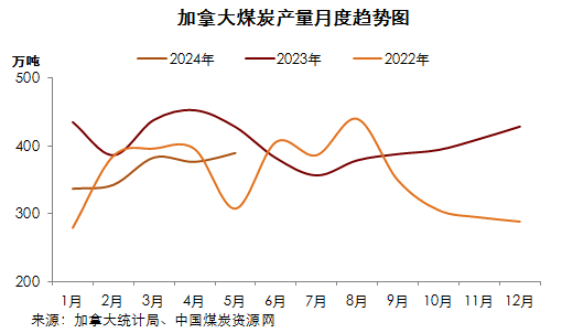 5月份,加拿大煤炭產(chǎn)量為389.2萬噸,同比減少38.5萬噸,降幅9.0%;環(huán)比增加13.0萬噸,增幅3.5%。