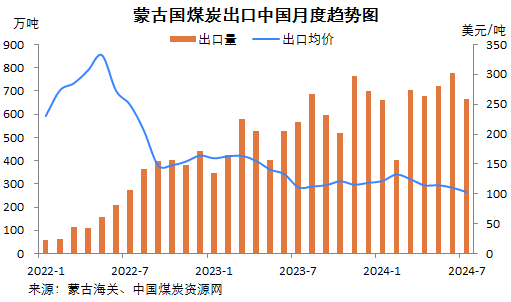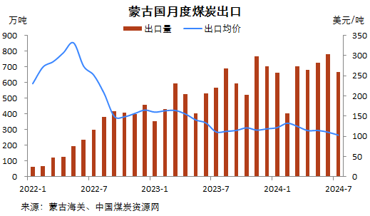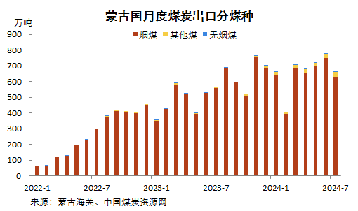 蒙古海關未給出單月數據,根據歷史數據計算得出,2024年7月份,蒙古國煤炭出口量為664.46萬噸,同比增加99.05萬噸,增幅17.52%;環比減少114.13萬噸,降幅14.66%。