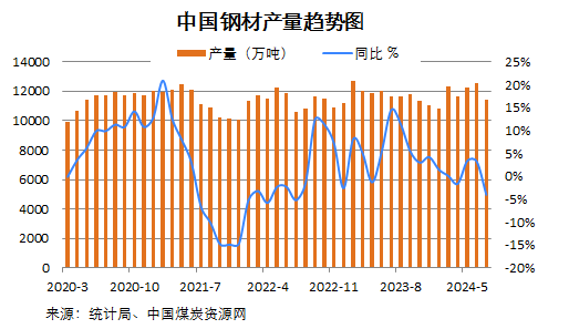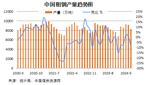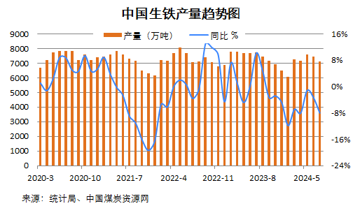 國家統計局數據顯示,2024年1-7月份,全國焦炭、粗鋼和生鐵產量同比依舊下降,而鋼材產量仍同比為正。具體來看: