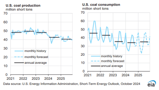 美國能源信息署(EIA)10月8日發(fā)布最新《短期能源展望》報告顯示,2024年,美國煤炭產(chǎn)量為5.1億短噸(4.63億噸),略高于前一月預(yù)期值5.01億短噸,較2023年的5.775億短噸下降11.7%。