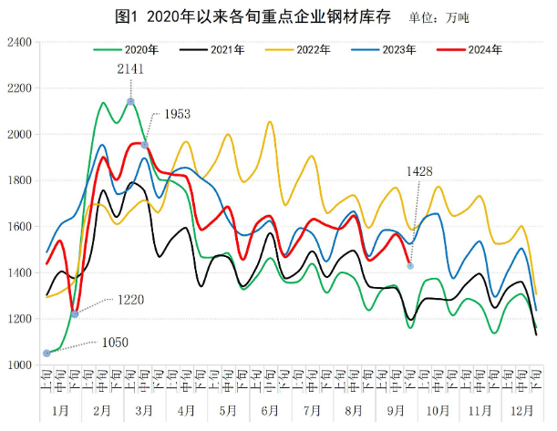 2024年9月下旬,重點統(tǒng)計鋼鐵企業(yè)(以下簡稱“重點企業(yè)”)鋼材庫存量1428萬噸,環(huán)比上一旬減少137萬噸,下降8.8%;比年初增加192萬噸,上升15.5%;比上月同旬減少26萬噸,下降1.8%;比去年同旬減少97萬噸,下降6.4%,比前年同旬減少160萬噸,下降10.1%。