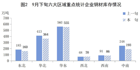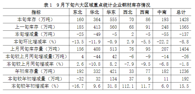 9月下旬,除西北地區(qū)重點企業(yè)鋼材庫存較上一旬略有下降外,其它地區(qū)均有不同程度減少(見圖2、表1),具體情況為: