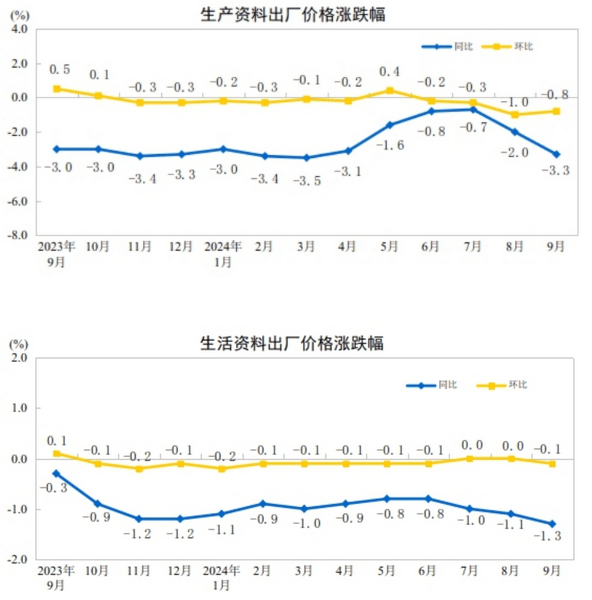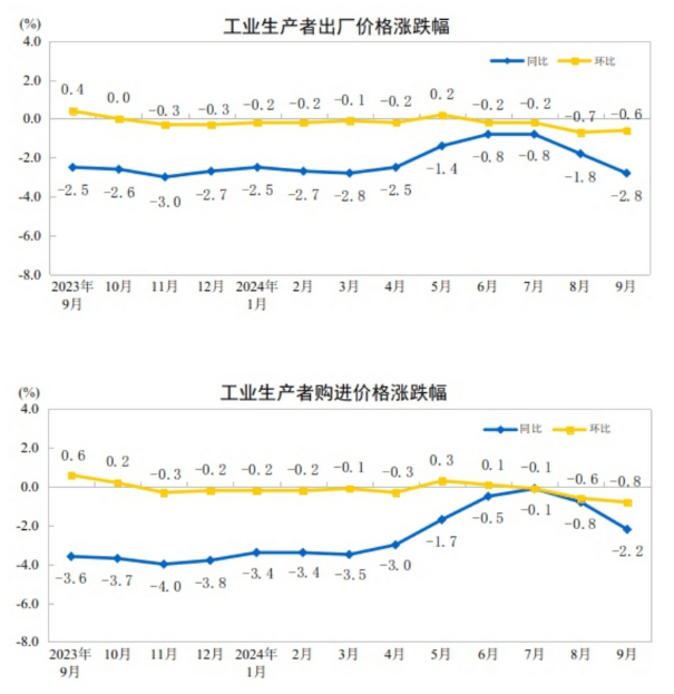 2024年9月份,全國工業生產者出廠價格同比下降2.8%,環比下降0.6%;工業生產者購進價格同比下降2.2%,環比下降0.8%。1—9月平均,工業生產者出廠價格比上年同期下降2.0%,工業生產者購進價格下降2.1%。