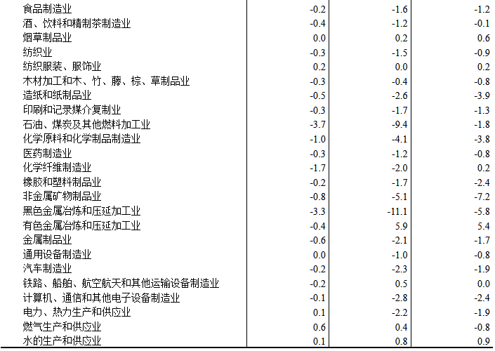 工業生產者購進價格中,黑色金屬材料類價格下降2.4%,燃料動力類價格下降1.4%,化工原料類價格下降1.1%,建筑材料及非金屬類價格下降0.8%,有色金屬材料及電線類價格下降0.6%,紡織原料類價格下降0.5%,農副產品類價格下降0.4%。