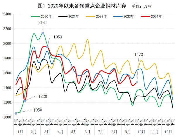 2024年10月上旬,重點統計鋼鐵企業(以下簡稱“重點企業”)鋼材庫存量1473萬噸,環比上一旬增加45萬噸,上升3.2%;比年初增加237萬噸,上升19.2%;比上月同旬減少24萬噸,下降1.6%;比去年同旬減少163萬噸,下降10.0%,比前年同旬減少159萬噸,下降9.7%(見圖1)。