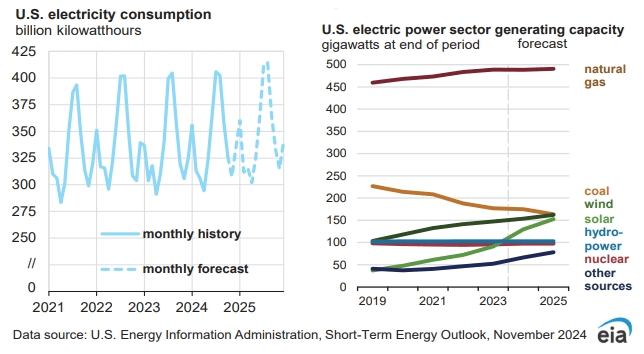 美國能源信息署(EIA)11月13日發布的最新《短期能源展望》報告顯示,2024和2025年,美國電力消費量預計將創歷史紀錄新高。