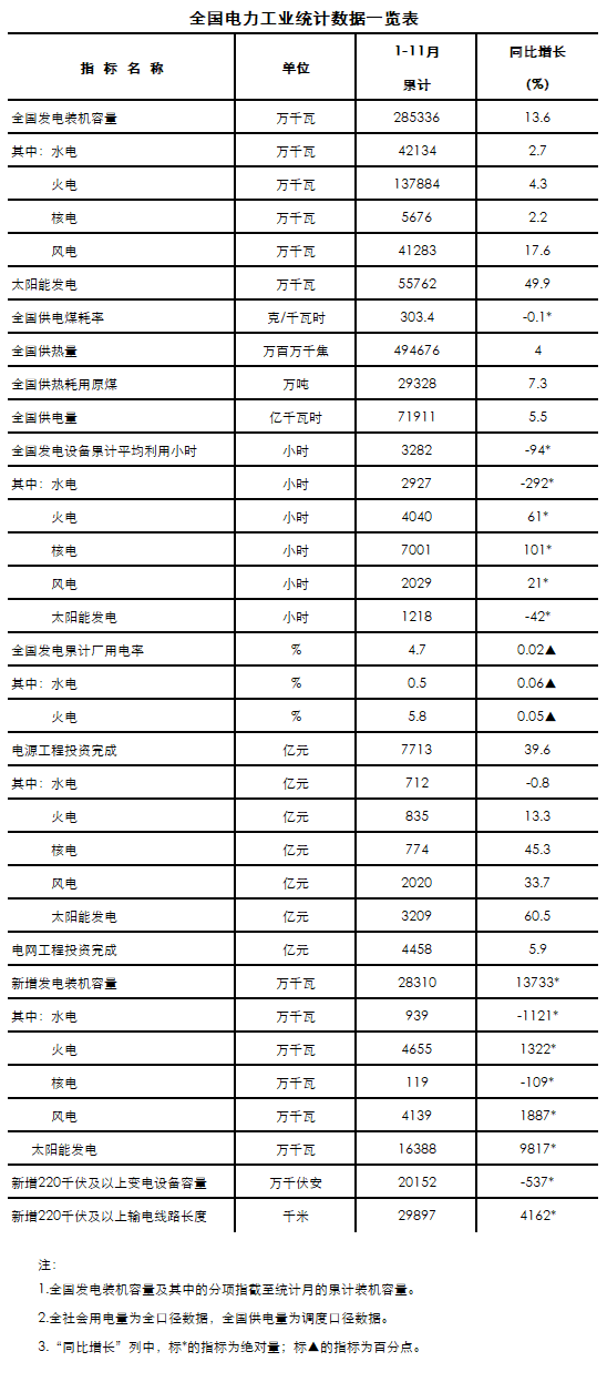 12月20日,國家能源局發布1-11月份全國電力工業統計數據。