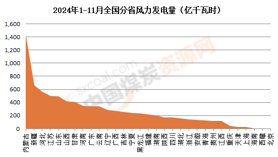 1-11月,內蒙古、新疆、河北、江蘇、山東風力發電量分別為1,434.0億千瓦時、659.8億千瓦時、559.6億千瓦時、497.4億千瓦時、492.2億千瓦時,同比分別增長23.1%、16.3%、-0.4%、6.7%和12.5%。
