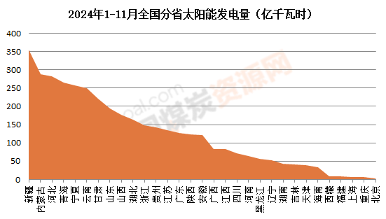 1-11月,新疆、內蒙古、河北、青海、寧夏光伏發電量分別為355.3億千瓦時、287.4億千瓦時、281.7億千瓦時、264.9億千瓦時、258.1億千瓦時,同比分別增長72.8 %、42.8 %、18.7 %、16.7 %和15.3 %。