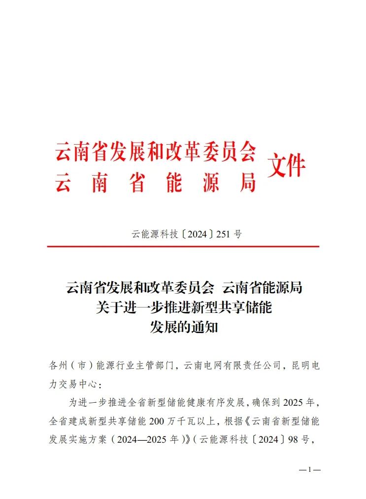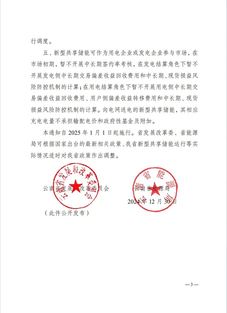 2024年12月30日,云南省發改委、云南省能源局聯合印發《關于進一步推進新型共享儲能發展的通知》。通知自2025年1月1日起施行。