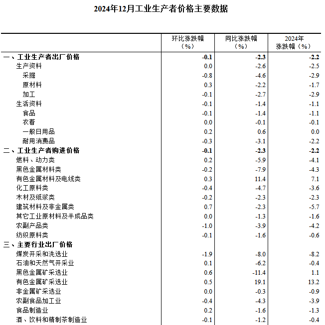 2024年12月份,全國工業(yè)生產(chǎn)者出廠價格和購進價格同比均下降2.3%,降幅比上月均收窄0.2個百分點;環(huán)比均下降0.1%。2024年全年,工業(yè)生產(chǎn)者出廠價格和購進價格均下降2.2%,降幅比上年分別收窄0.8、1.4個百分點。