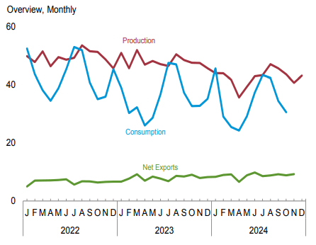 2024年全年,美國煤炭總產量為5.12億短噸,較2023年的5.77億短噸下降11.39%。